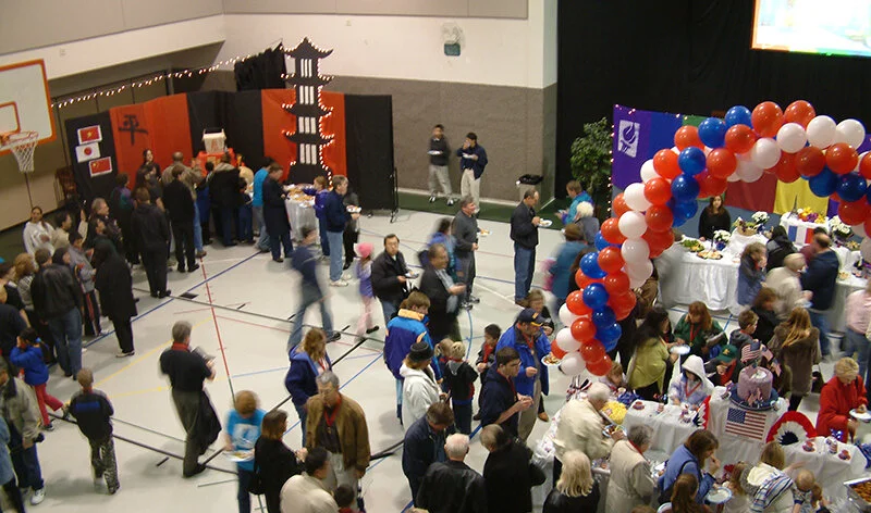 This event is a great way for people to get to know each other. We create a large group game with tables competing for prizes. For the international theme, we showed famous sites and had people guess them. They got one point for the landmark and another point if they could name the country.